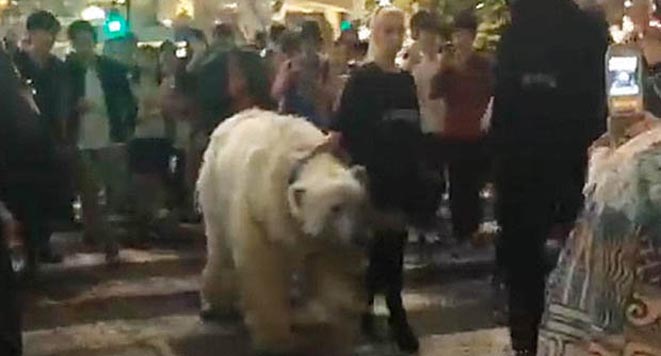 نشرت صحيفة "ديلي ميل" البريطانية فيديو لفتاة شقراء تمسك بدب كبير مربوط في طوق. خلال تجولها بشارع "شيبويا" الذي يعج بالحركة في طوكيو.