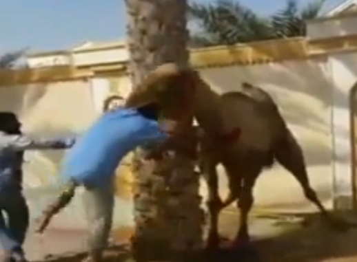 شاهد.. ناقة تعض رأس جزار وترميه بعيداً