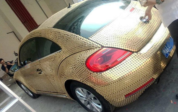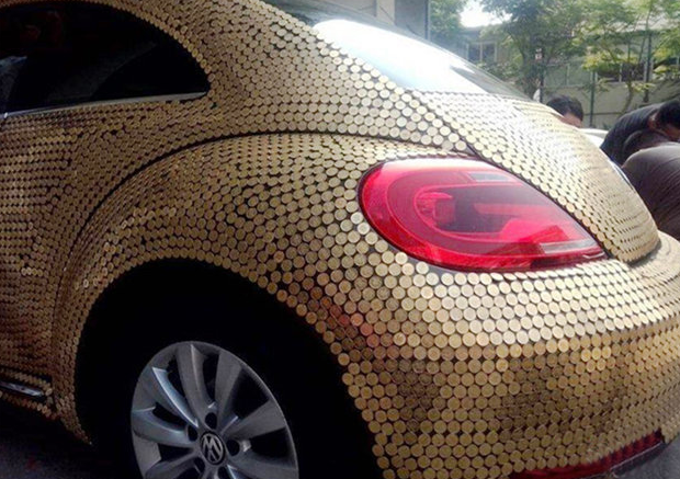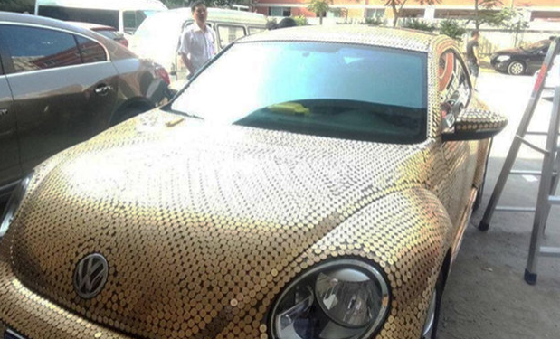 قام الشاب لوك توان (27 عاما) بتحويل سيارته لقطعة فنية مميزة من خلال تغطيتها كاملة بقطع نقدية من فئة واحدة مذهبة اللون.