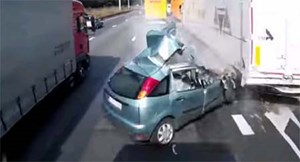 انتشر مقطع فيديو لحادث سير مروع، يظهر فيه اصطدام سيارة بشاحنة كبيرة.