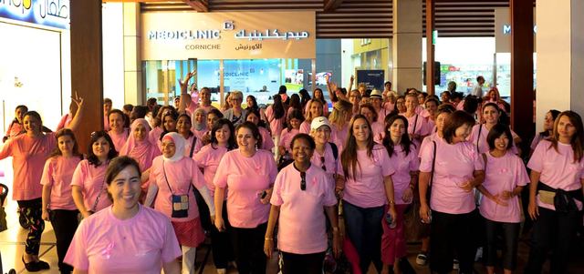 شاركت مجموعة من النساء في مسيرة وردية دعماً لشهر التوعية حول سرطان الثدي، في المركز التجاري العالمي في أبوظبي، واستمرت المسيرة لمدة ساعة، قُدم خلالها للسيدات المشاركات استشارة مجانية وفحص مجاني لكشف سرطان الثدي في عيادة «ميديكلينيك»، كما حصلنَ على طلاء أظافر وردي اللون لدى «ذا نيل سبا».