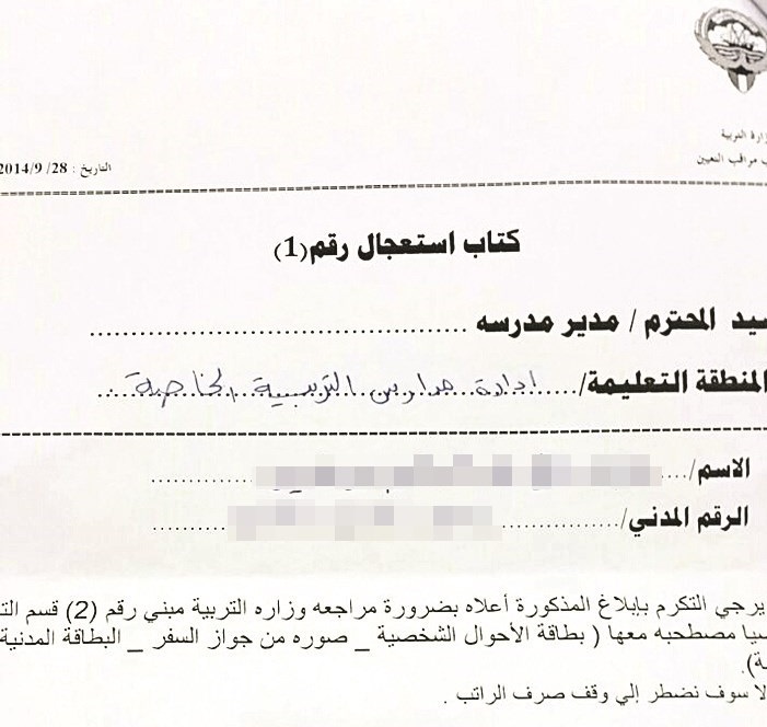 طلبت وزارة التربية والتعليم الكويتية، ممثلة في قطاعها الإداري، حضور موظفة متوفاة منذ 6 سنوات، للمراجعة في مبنى الشؤون الإدارية مصطحبةً معها بطاقة الأحوال الشخصية وصورةً من جواز السفر والبطاقتين المدنية والبنكية.
