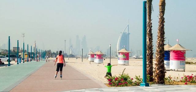 فتاة تستمتع بممارسة الرياضة على «ممشى كورنيش جميرا» في دبي، الذي دشن أخيراً، بطول 14 كيلومتراً، ويبدأ من خلف «منتجع شاطئ دبي مارينا»، وصولاً إلى «برج العرب».