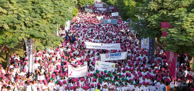 وفي حديقة زعبيل شارك الآلاف في «مسيرة برجمان الوردية»، وتندرج المسيرة الخيرية، التي تعد الأطول والأكثر جذباً في الإمارات، ضمن النسخة الـ18 من حملة «بصحة وعافية» المقامة على مدار العام. وترأست حملة هذا العام مجموعة من الناجيات من مرض سرطان الثدي، اللواتي أسهمن في نشر رسالة «الكشف المبكر يساعد على إنقاذ الأرواح»، كما شاركت في المسيرة مجموعة «بريست فريندز»، وناجيات أخريات من شتى أنحاء دبي، ممن تضامنّ لدعم الحملة.