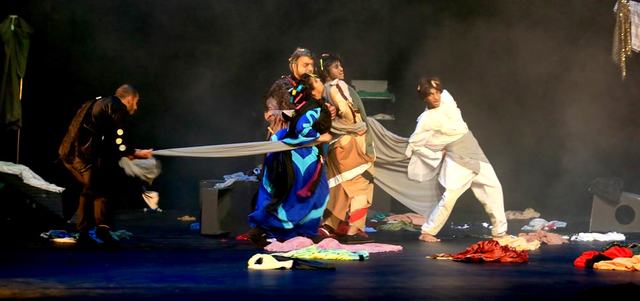 نبرة جلد الذات والسخرية اللاذعة من الأنا وحتى من الآخر، الذي يدخل في زمرة «الأنا» الجمعية عالية جداً في «بقع»، لكن أداء الممثلين لم يكن على القدر ذاته، ما جعل المتلقي في كثير من الأحيان بعيداً عن سياق تطور الصراع، باستثناء أداء إبراهيم استادي، الذي قام بدور «القديم»، الذي يتسلط دائماً على سواه من الملابس، باعتباره أكثرهم قدماً، على الرغم من أن تراتبية الملابس تختلف عن التراتبية الرسمية، فيغدو الحديث والجديد فيها هو الأعلى قيمة.