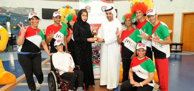 تضامن طلبة مركز راشد للمعاقين مع المنتخب الإماراتي في «خليجي 22»، من خلال احتفالية ملونة لمؤازرة المنتخب، بحضور الشيخ جمعة بن مكتوم آل مكتوم، العضو المنتدب للمركز، والمدير العام مريم عثمان، ومنظِّمة المبادرة مهرة فلكناز. وارتدى الطلبة زي المنتخب وزينوا رؤوسهم بالشعر المستعار بألوان العلم، ورفعوا علم الإمارات، وغنوا الأغنيات الوطنية.