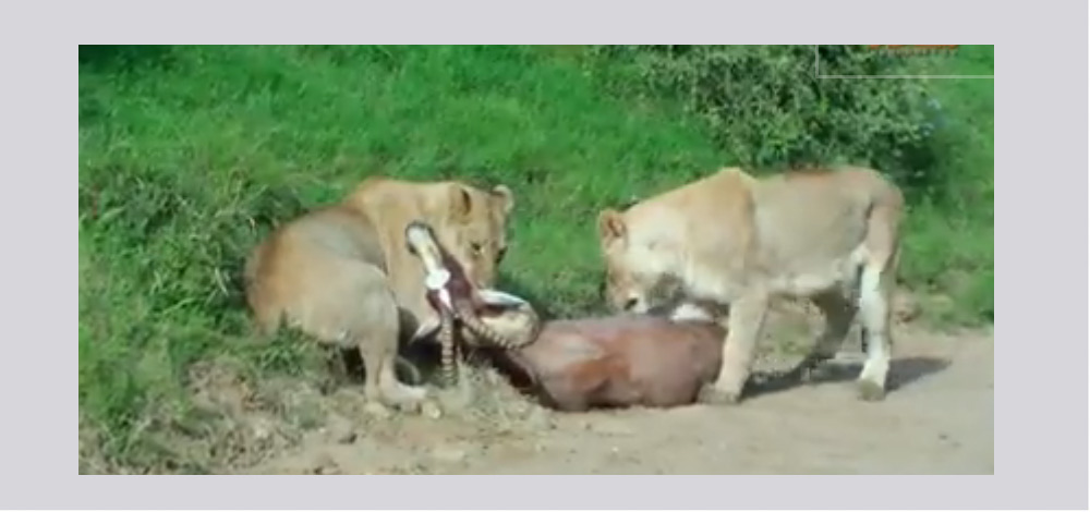 وأظهرت لقطات الفيديو أسدين ينتظران مرور الفرائس ليقتنصا إحداها حيث حاول الغزال الإفلات من الكمين القاتل بالقفز عالياً في الهواء إلا ان براعة الأسد "الطائر" مكنته من الإيقاع بفريسته وهي طائرة ليقوم الأسد ورفيقه من طرحها أرضا وافتراسها.