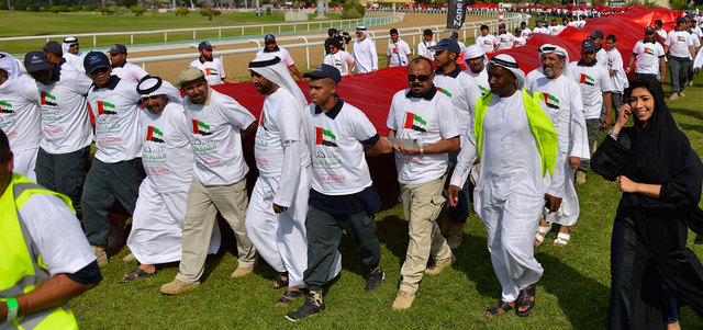 حطّمت دولة الإمارات، أمس، الرقم العالمي المسجل في موسوعة غينيس للأرقام القياسية في عدد الأشخاص الذين يحملون علم بلادهم، وذلك بعد مشاركة أكثر من 2000 طالب من معهد أبوظبي للتعليم والتدريب المهني، وبالتعاون مع نادي أبوظبي للفروسية، برفع العلم الوطني لدولة الإمارات العربية المتحدة.