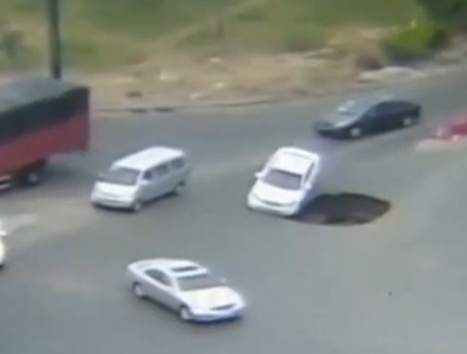بالفيديو..شاهد لحظة سقوط سيارة في حفرة!