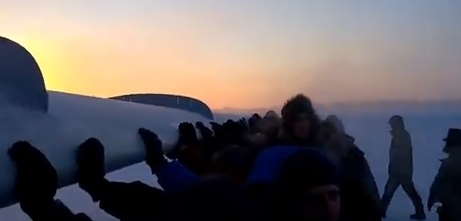 وكما يظهر في الفيديو، فإن الحادثة وقعت في المناطق الروسية، وقام المتعاونون بحث بعضهم على الدفع بصورة أقوى حتى تمكنوا من إنجاز المهمة.