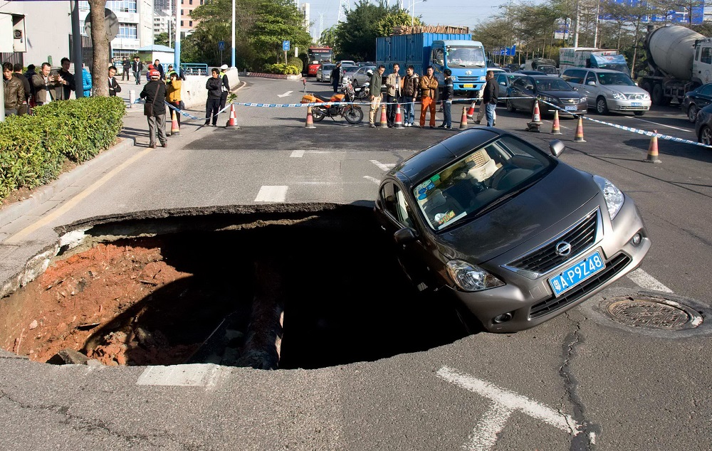 وذكرت وكالة رويترز أن الهوة التي تبلغ مساحتها 25 متراً مربعاً ظهرت صباح اليوم في شارع بمنطقة غوانزهو بمحافظة غوانغدونغ حيث انزلقت السيارة فيها بشكل جزئي.