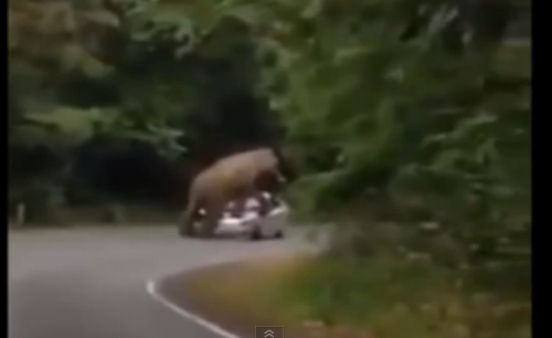 ويظهر الفيل في مقطع الفيديو وهو يجلس على مقدمة السيارة ويحاول تسلقها والصعود على جزئها الأمامي.