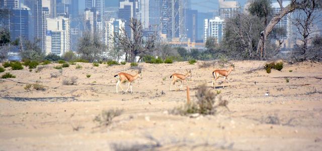 مجموعة من الغزلان على طريق لطيفة بنت حمدان باتجاه منطقة ند الشبا في دبي.