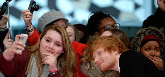إد شيران في صورة «سيلفي» مع عدد من المعجبين بعد انتهاء الحفل. أ.ف.ب