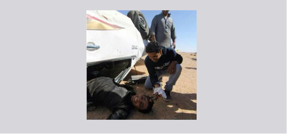 تداولت مواقع تواصل اجتماعي صورة التقطها شاب سعودي يظهر فيها بصحبة "جثة" تحت عجلات مركبة في احدى المناطق الصحراوية بالمملكة، ليتضح بعدها أن هذه "السيلفي" ما هي إلا تمثيلاً بين مجموعة من الشباب حاولوا لفت الانتباه، كما ذكرت مواقع تواصل اجتماعي.