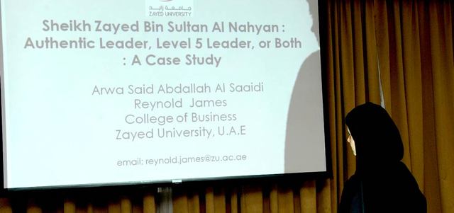 سعياً إلى تأسيس فهم أكاديمي وعلمي صحيح للتميز القيادي في شخصية المغفور له الشيخ زايد بن سلطان آل نهيان، قدمت الطالبة بالسنة النهائية بكلية الإدارة بجامعة زايد – فرع أبوظبي، أروى سعيد السعيدي، إلى المؤتمر الدولي الـ11 حول العلوم الاجتماعية والتجارية، الذي عُقد في دبي أخيراً، ورقة علمية نالت إعجاب المشاركين، وأجروا معها مناقشة واسعة، وطالبوها خلالها بنشر ورقتها في دورية علمية متخصصة، إضافة إلى إجراء مزيد من البحث حول الموضوع، وتطوير ورقتها إلى كتاب.