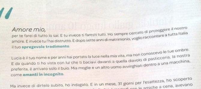وكتب الرجل الذي وقع باسم "إنزو" إلى زوجته "لوسيا" في الإعلان الذي نشرته صحيفة "كوريير ديلا سيرا""بعد سبع سنوات، أريد أن أخبر إيطاليا كلها بشأن خيانتك الدنيئة".
