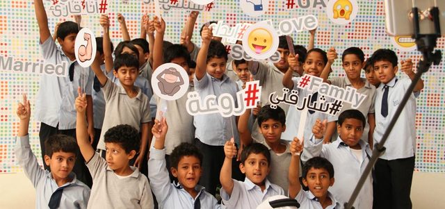 أطفال من مهرجان الشارقة القرائي أمام جناح تعداد الشارقة 2015. من المصدر