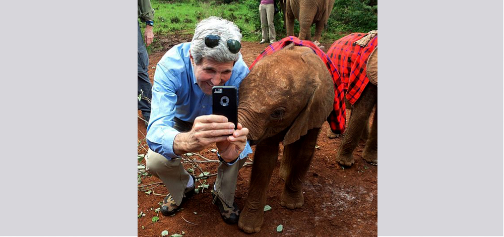 اختار وزير الخارجية الأميركي جون كيري لصورته التذكارية في كينيا، أن تكون سيلفي مع فيل صغير، التقطها معه خلال جولته في إحدى حدائق مدينة نيروبي الكينية.