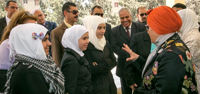 وكان في استقبال سموها، لدى وصولها مبنى المدرسة، نائب مساعد وزير الخارجية لشؤون اللاجئين والهجرة، السفير طارق معاطي، ومديرة مديرية التربية والتعليم بمحافظة الجيزة، الدكتورة بثينة كشك، ومسؤولة المفوضية السامية لشؤون اللاجئين بالأمم المتحدة في القاهرة، إليزابيث تان، ووكيل أول وزارة التربية والتعليم بالديوان العام بالقاهرة، الدكتور يوسف سليمان، ومسؤول التعليم في المفوضية بالقاهرة محمد شوقي، وعدد من المسؤولين في المفوضية ووزارة التربية والطاقم التدريسي بالمدرسة.