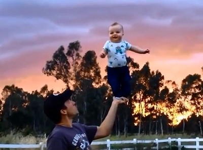 وتوضح اللقطات الطفل وكأنه يحلق في السماء واقفاً على كف والده فقط.