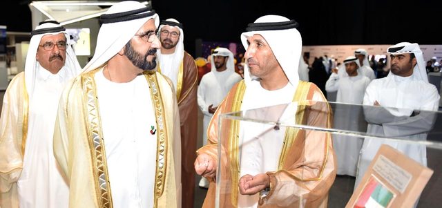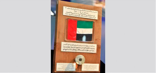 صاحب السمو الشيخ محمد بن راشد آل مكتوم، نائب رئيس الدولة رئيس مجلس الوزراء حاكم دبي، خلال اطلاعه على عَلَم الإمارات، الذي حلّق إلى القمر عام 1973 على متن المركبة «أبولو 17»، وكان العَلَم قد قُدم هدية إلى المغفور له الشيخ زايد بن سلطان آل نهيان، من الرئيس الأميركي ريتشارد نيكسون في عام 1973.