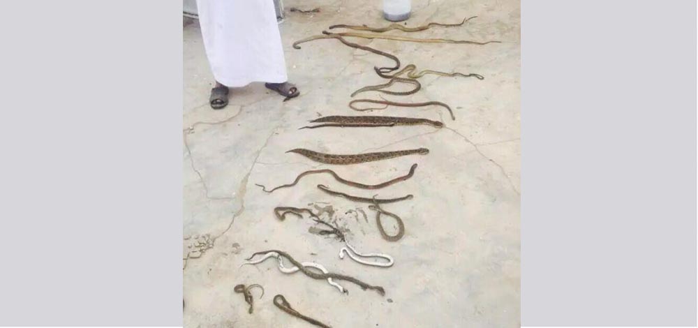 وأضافت الصحيفة أن رجال الدفاع المدني اضطروا إلى قتل الثعابين بعد هجوم واحداً منهم على اطفائي أثناء مباشرة الحريق، الذي وقع في احدى المنازل في محافظة الدرب بمنطقة جازان.