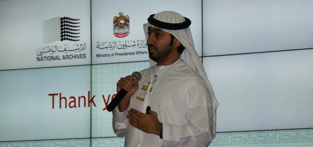 شارك الأرشيف الوطني لدولة الإمارات العربية المتحدة في معرض ومؤتمر الحكومة الذكية بمحاضرة بعنوان «الإبداع يفوق التوقعات»، ألقاها رئيس قسم تقنية المعلومات، حمد المطيري، وقدم لها بنبذة عن الأرشيف الوطني ودوره في جمع ذاكرة الوطن وحفظها، ثم توقف مع توجّه الحكومة إلى إسعاد الشعب ورفاهيته بواسطة استخدام التقنيات والتطبيقات الذكية وتجاوب الأرشيف الوطني مع هذا التوجّه، ثم استعرض التقنيات المستخدمة في الأرشيف الوطني والخطط المستقبلية التي تواكب التقنيات الحديثة.