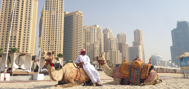 كأنها استراحة بين زمانين، بصحبة شاهدين من الماضي والحاضر: «سفينة الصحراء» التي حملت على ظهرها الخير والحضارة، وأبراج المارينا التي تبدو حارساً على الجمال على أحد شواطئ دبي الذهبية.