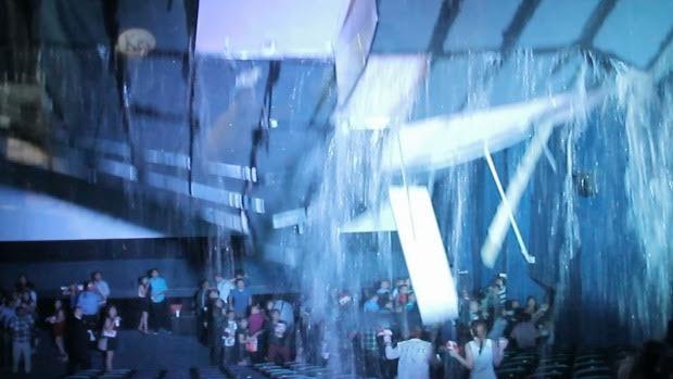 ويبين المقطع الذي صوره أحد رواد السينما المياه وهي تنغمر بغزارة من السقف، مما اضطر العديد من المتفرجين للفرار من التسرب الشديد للمياه، قبل ثوان من انهيار السقف بشكل مفاجئ، مما أسفر عن إصابة العشرات.
