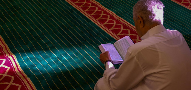 مع كتاب الله يختلي، وبآياته يأنس، لعله يختم الذكر أكثر من مرة خلال شهر رمضان الفضيل، فيحظى بثواب الصيام وقراءة القرآن.