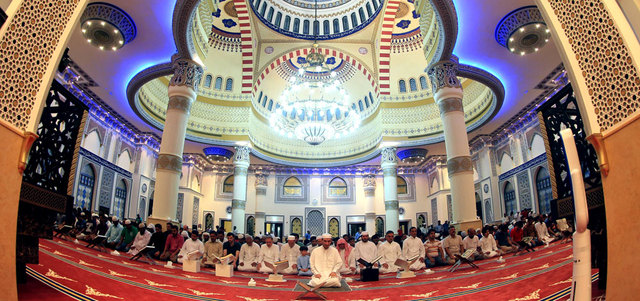يهمسون بـ«التشهد الأخير» والتحيات المباركات، ودعوة الصائم التي لا تُرد، خلال صلاة المغرب، في مسجد الفاروق عمر بن الخطاب بمنطقة الصفا في دبي.