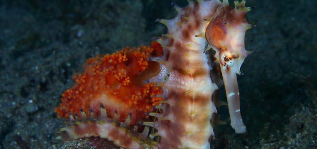 يُعدّ حصان البحر أو فرس البحر من أجمل الكائنات البحرية على الإطلاق لجاذبية شكله الذي هو غاية الروعة والجمال. وهناك أكثر من 50 نوعاً من فرس البحر منتشرة في محيطات وبحار العالم، تنطوي كلها تحت جنس واحد هو هيبوكامبس، وهي كلمة إغريقية الأصل تعني الحصان الملتوي، وتتفاوت أطوال أنواع حصان البحر، فمنها ما لا يتعدى طوله 15 مللميتراً، ومنها ما يصل إلى نحو 40 سنتيمتراً، وتتلون أفراد حصان البحر بألوان جميلة براقة عدة، كالبرتقالي والبني والأصفر والأحمر والأسود والأخضر الزيتوني. حصان البحر نظامه الغذائي خليط من النبات والحيوان، حيث يتغذى على العوالق والقشر والأنواع الصغيرة من الأسماك والطحالب، ويقوم بامتصاص الطعام عن طريق فمه الطويل الرفيع إلى الجسم مباشرة، بسبب عدم وجود أسنان ولا معدة. صورة لحصان البحر الأحمر من منطقة منادو بإندونيسيا.