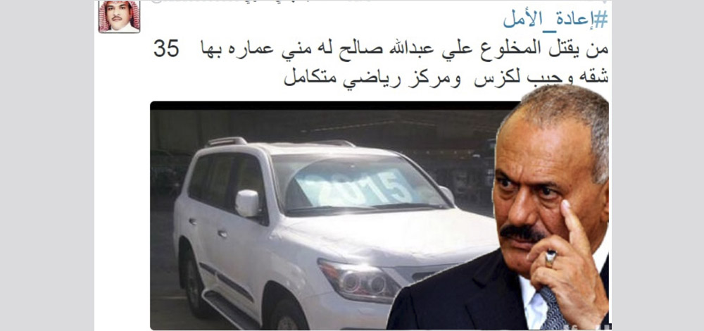 وقال العنزي في تغريدة له على موقع "تويتر" ونشرتها الصحف السعودية "من يقتل المخلوع علي عبدالله صالح له مني عمارة بها 35 شقة وسيارة لكزس ومركز رياضي متكامل".