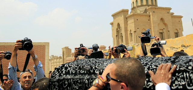 وبعد الصلاة حمل مشيعون النعش الذي لف بعلم مصر ومن فوقه قطعة قماش سوداء مطرزة بآيات من القرآن الكريم بخيوط فضية.