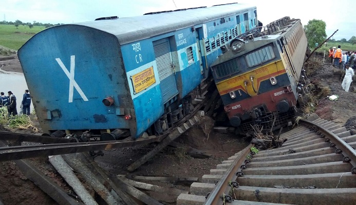 لقي شخصا مصرعهم وأصيب حوالي 100آخرين في الهند إثر خروج قطارين سريعين عن القضبان على جسر تغمره مياه الفيضانات فوق نهر وسط البلاد.