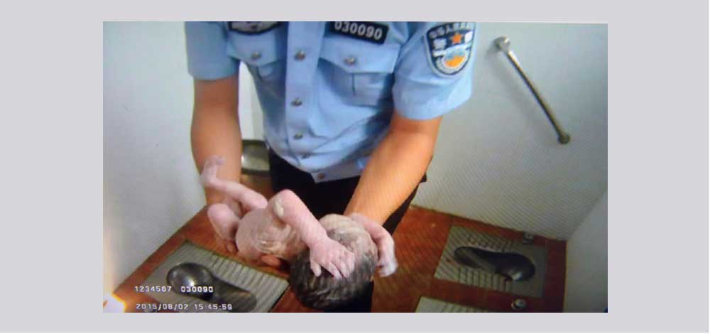 و توجه الشرطي "تشيان فينغ" إلى المكان ووجد الطفلة الرضيعة. "فينغ "، أوضح في حديث لصحف محلية، أن رأس الطفلة كان في الأسفل ولم يكن يرى من جسمها سوى أقدامها.