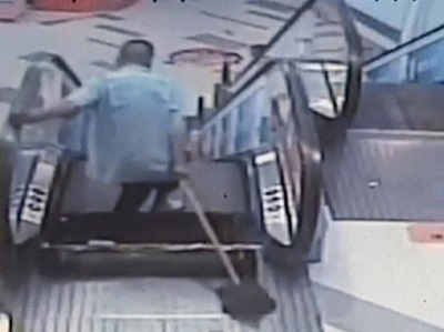 وشهد مركز تجاري في مدينة شنغهاي تعرض عامل إلى التعثر في فجوة سلم كهربائي بعد تعطله وانهيار جزء منه ليسقط العامل إلى الأسفل.
