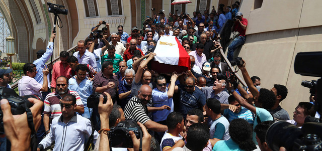 مشيّعون يحملون نعش نور الشريف ملفوفاً بعلم مصر ليوارى الثرى بعد رحلة عطاء فني امتدت لنحو 50 عاماً. إي.بي.إيه