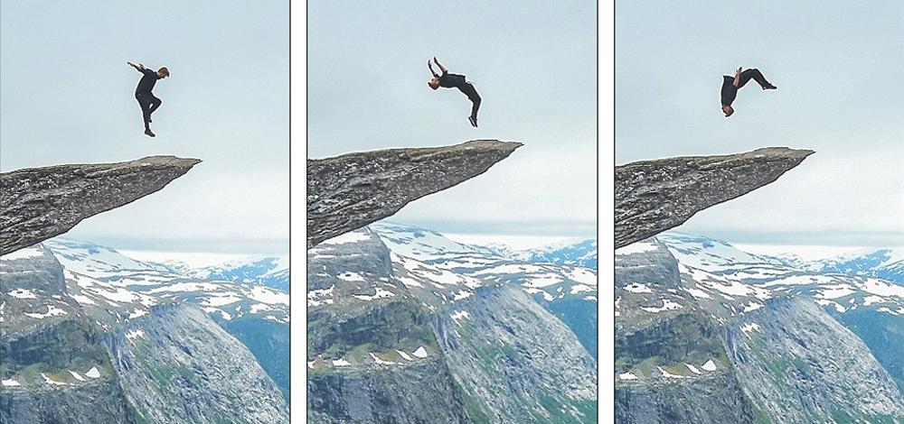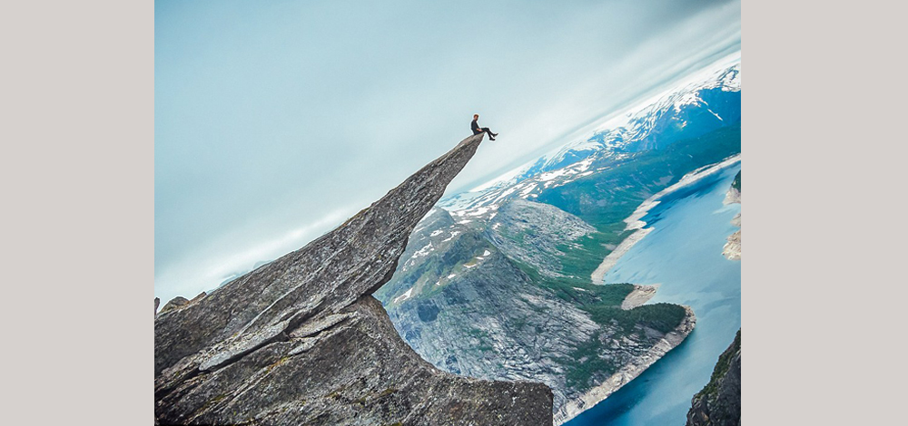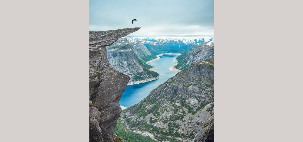 تحدى الشاب توبي سيغار البالغ من العمر 21 عاما خوفه من المرتفعات بتنفيذه قفزات بهلوانية في الهواء في مرتفع يقع جنوب النرويج ، حيث نفذ قفزاته من على ارتفاع 700 قدم فوق سطح بحيرة "رينجدالسفاتينت" .
