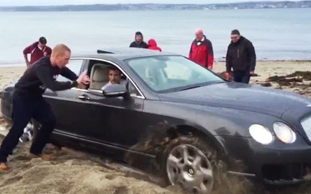 تداول نشطاء على مواقع التواصل الاجتماعي فيديو يظهر قيام مجموعة أشخاص بمحاولات عدة لإنقاذ سيارة بينتلي تعود لشاب عشريني ، غفل عن وزن سيارته الثقيل حيث تبلغ 2.5 طن ، ما أدى إلى غرق دواليبها في رمل شاطئ "كورن وول".