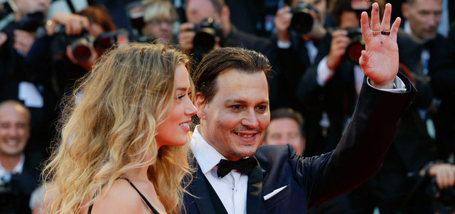 ديب يلوّح لمعجبيه في «البندقية» برفقة زوجته أمبر هيرد. أ.ب