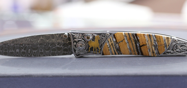 تضمن المعرض، الذي يستمر حتى بعد غد، العديد من الأجنحة التي تلفت الأنظار، وتستحق التوقف أمام ما تقدمه من معروضات، من بينها جناح شركة «تمرين» التي تعرض عدداً من الأسلحة المميزة، وهي تمثل 30 شركة من دول مختلفة، من بينها الإمارات وأميركا وبريطانيا؛ مثل شركة «أبوظبي نيف»، و«فوكس نايف» الحائزة جوائز عالمية، بحسب ما أوضح مدير الشركة، محمد الأميري، لـ«الإمارات اليوم»، مشيراً إلى أن من أبرز المعروضات التي تعرضها الشركة هذا العام مجموعة من السكاكين يقدمها ويليام هنري من الولايات المتحدة تتضمن خمس سكاكين، متوافرة حصرياً في معرض أبوظبي. ومنها سكين مصنوعة من الفولاذ الدمشقي المقاوم للصدأ بمقبض من «الماكوما غاما» المعدني المشغول على شكل الخشب، وناب من فيل ماموث عمره 10 آلاف سنة. ونقش على إحدى السكاكين رأس صقر، ويبلغ سعر هذه السكين 50 ألف درهم، بينما نقش على سكين أخرى رأس أسد، وبلغ سعرها 36 ألف درهم، وهو نفس سعر السكين التي تحمل نقشاً يدوياً للخيل.