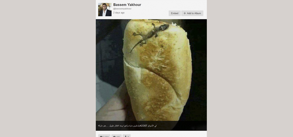 نشر الممثل السوري باسم ياخور صورة على حسابه في انستغرام تظهر مفاجأة غير متوقعة في قطعة الخبر التي يأكلها ، حيث أن حيوان "أبو بريص" كان في انتظاره مع القضمة الأولى بعد أن غفل أصحاب المطعم عن وجوده في الساندويش وفي المطعم .