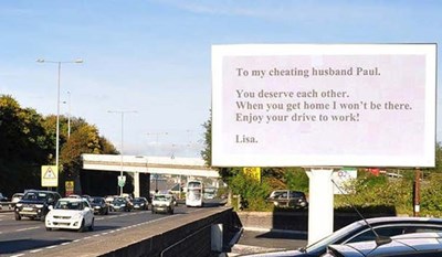 وأضافت الصحيفة أن الزوجة طلبت من شركة الاعلانات المصممة للافتة أن تضعها في موقع استراتيجي بالقرب من طريق رئيسي سريع في مدينة شيفيلد شمال بريطانيا، حيث كتبت بها "إلى زوجي الخائن بول.. أنتما تستحقان بعضكما، لن تجدني بالمنزل لدى عودتك استمتع بقيادتك للسيارة إلى عملك.. ليزا".