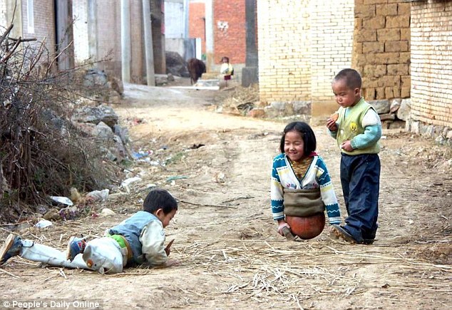 فلم يملك جد الفتاة خياراً سوى قطع كرة سلة قديمة، وتثبيتها أسفل الجزء العلوي من جسدها.