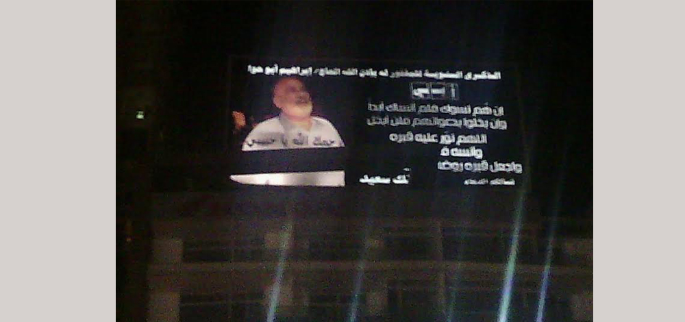 وكتب الشاب على اللافتة : "الذكرى السنوية للمغفور له بإذن الله أبي .. إن هم نسوك فلم أنساك أبدا .. وإن بخلوا بصوتهم فلن أبخل .. اللهم نور عليه قبره وآنسه فيه.. واجعل قبره روضة من الجنة.. نسألكم الدعاء”.