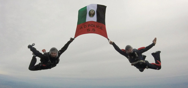 هبوط مظلي بالعلم الإماراتي لعناصر مظليي الشرطة الإيطالية، خلال استقبال وفد من إدارة الدعم الأمني، في الإدارة العامة للإسناد الأمني بالأمانة العامة لمكتب سمو نائب رئيس مجلس الوزراء وزير الداخلية، الذي يزور مدينة فيتشنزا الإيطالية لأيام، لمشاركة شرطة الدرك الإيطالية «الكارابينييري» في منطقة فيتشنزا مهامها اليومية.