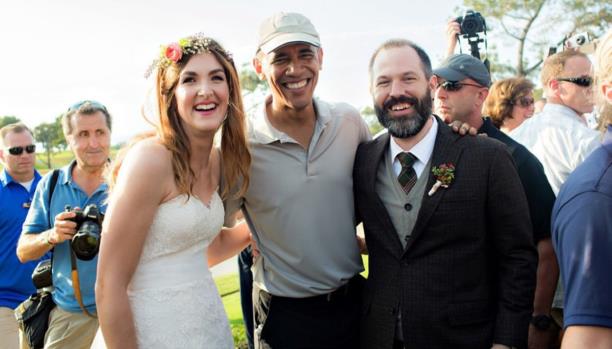 شكل ظهور الرئيس الأميركي، باراك أوباما، في حفل زفاف في جنوب كاليفورنيا، مطلع الأسبوع الحالي، مفاجأة كبيرة، إذ وبعد انتهائه من جولة للعب الغولف، توقف لالتقاط الصور مع عروسين.