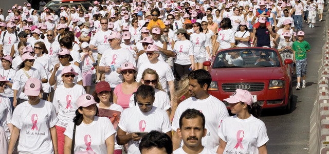 منذ بداية أكتوبر، أو «الشهر الوردي» كما بات يُعرف في العالم، تشهد دولة الإمارات عدداً كبيراً من المبادرات التي تهدف إلى التوعية بمرض سرطان الثدي، حيث استضافت أبوظبي، أمس، فعاليات «السباق الوردي»، الذي يُقام للعام الثالث على التوالي، بمشاركة أعداد كبيرة من المتسابقين من مختلف الأعمار والجنسيات، ومن المقرر أن يعود ريع السباق لمصلحة «مؤسسة الجليلة»، من أجل دعم وتمويل أبحاث تهدف إلى تحويل سرطان الثدي من مرض قاتل إلى حالة مرضية قابلة للعلاج وطويلة الأمد. وأقيم السباق لمسافة خمسة و10 كيلومترات، بتنظيم من بنك أبوظبي التجاري، ومدينة زايد الرياضية، ورعاية «صناعات» إحدى أكبر الشركات القابضة في مجال الاستثمار الصناعي في دولة الإمارات.وتضامناً مع جهود مكافحة مرض سرطان الثدي، اكتست صحيفة «الإمارات اليوم» أمس، بالتعاون مع «براند دبي»، باللون الوردي الذي بات رمزاً لمقاومة هذا المرض منذ عام 1992، عندما قامت إيفلين إتش لودر، وشركة التجميل Estée Laude بصناعة شرائط وردية اللون، وبيعها في متاجر شركة مستحضرات التجميل في نيويورك، لدعم مريضات السرطان والناجيات منه، وتم اختيار اللون الوردي لما يحمله من تفاؤل وأمل في الشفاء، كما أصبح شهر أكتوبر موعداً سنوياً للتوعية من هذا المرض في مختلف أنحاء العالم.